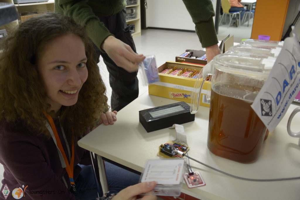 After the question hours were over, we returned to the entrance area for a leisurely lunch. Participant Mathis (DL7MLP) programmed his own booking system for beverages with RFID chip cards – alias the camp name badges – and tried it out directly. Afterwards we went next door to the amateur radio centre, where we continued directly with a short guided tour through the camp rooms Alpha, Bravo, Charly, Delta, Echo, Foxtrott and Golf, as well as through the radio tower.