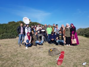 We took the opportunity of the coming of Abdel 7X2TT/M0NPT to Algeria, to have a field day in the beautiful beach of Zemmouri 60Km east of Algiers. With the help of the Boum Community we gathered 12 youngsters (what 4 cars could take) in order to show them the hobby from a new perspective, Abdel 7X2TT/M0NPT brought equipment to use the Satellite Es’Hail as a repeater to make DXs, as well as, other satellites. We also used a small CW beacon from those we made in the aforementioned electronics workshop that we hid under the hood of a car and pulled a long thin wire from it on the ground and asked the participants to find it with the ARDF receivers. It was a fun task because nobody could imagine the location of the beacon.